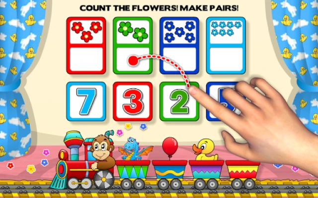 The ENTHUSIASTIC MONKEY CHARACTER is going to guide children through the whole game. As a reward after each round, children receive the opportunity to become creative artists and CHANGE THE DESIGN OF THE TRAIN, or obtain STICKERS TO SHOW OFF ON THEIR BOARD!